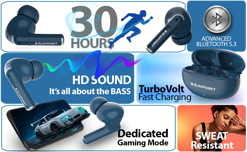 Intelli Switch Off Technology-This is one very clever technology that’s loaded in the BTW09 AIR earbuds. It is an artificial intelligence sort of technology that puts your earbuds to sleep when not in use for more then 2 minutes.Inside each earbud Blaupunkt has loaded drivers of the highest quality. These have been tuned to the design and audio amplifiers to deliver the most balanced sound. Another amazing feature of these earbuds is the dedicated gaming mode. Better audio technology has resulted in extremely low latency and faster response to game inputs.Playtime is the most important feature while choosing earbuds. This is where the BTW09 AIR scores high. The carry case has a large efficient battery that charges fast and stores the energy for longer. Blaupunkt has been investing in the best MIC technology for a long time now. Their Clear A.I. Mics are probably the most acoustically advanced you can find today. The BTW09 AIR gets the latest version of these Clear A.I. Blaupunkt is an iconic German brand with nearly 100 years of experience in the Audio world. It is known and respected globally as a brand that delivers the higher levels of reliability, durability and value for money. Once you move up to the Blaupunkt audio experience nothing else will sound as good.