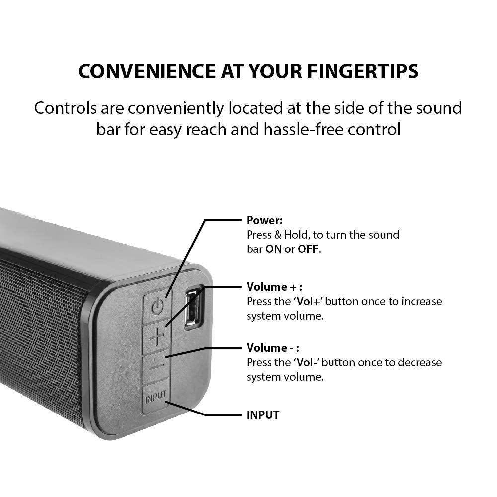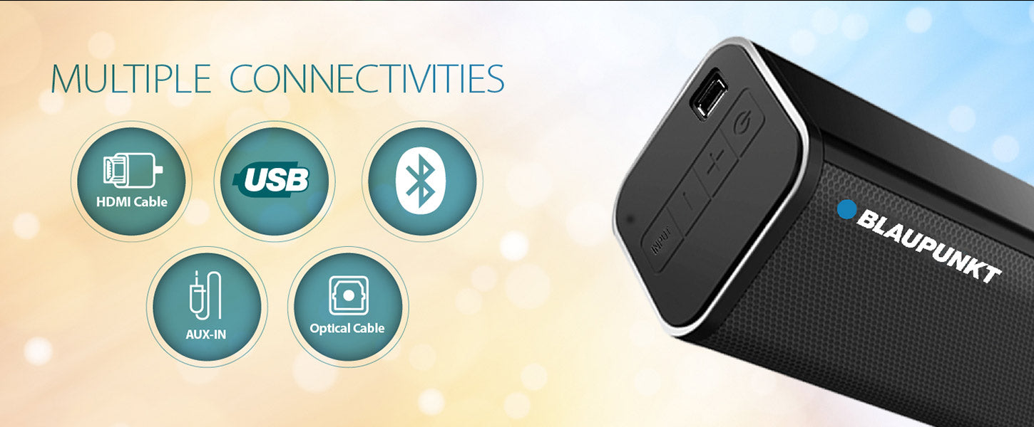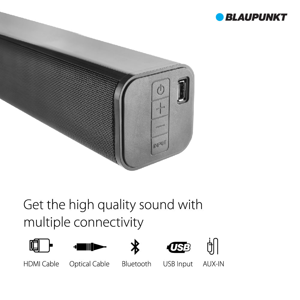 Blaupunkt Dolby soundbar SBW01 welcome you to the incredible world of Dolby Audio 3D sound. Here sound reaches new heights. This is the tech that creates a multiplex theater feel at home. 120Watts of power. This is what most audiophiles dream of. In addition to the volume you get clarity, sound separation and bass. Perfect to bring to life all audio visual content. If you are a movie buff then this is the soundbar for you. The bar delivers all the mid and high ranges with separation. The Woofer adds a rich bass. And together they make every movie a blockbuster. The SBW01 is one of the only Soundbar in the industry which gives flexibility of multiple connectivity options like HDMI ARC, Optical IN, Bluetooth and AUX in. This doesn't support remote but have all the controls on the soundbar & rest you can control through Bluetooth on the phone.