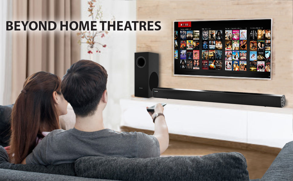 The German edge. That means precision, quality and performance levels that are hard to beat. You get it all with the Blaupunkt Recertified SBW50.120Watts of pure sound comes pouring out like a tidal wave that is rich in bass and has crisp high and mid ranges. Pump up the volume and see how the sound stays true and clean. This soundbar is built to take performance to the next level. Sleek and sophisticated this is classic European design. It has an understated elegance that adds a touch of class to your audio visual experience. The material used are of the finest grade and will look new even after years of use. The woofer with a difference. A side firing design enhances the bass quality adding depth and a texture that is rich and solid. You will feel the thump deep inside you. It connects with everything and how! You get Bluetooth, HDMI-ARC, USB and AUX-In. That means all your devices are invited to join in.